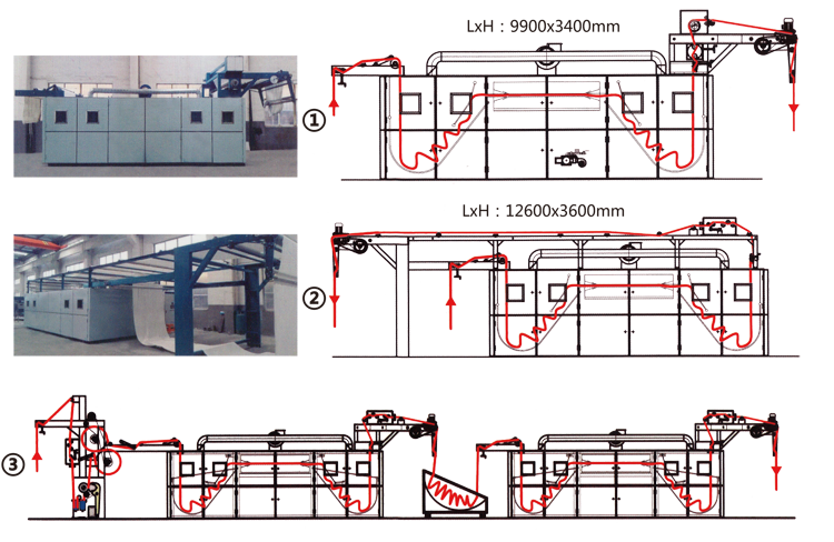 | 50m/min | 1800-3600mm | 96KW(實際Actua65KW) | 130℃蒸汽 Steam 170℃天然氣 Natural gas | 蒸汽/天然氣/導熱油 Steam, Natural gas, Heat conducting oil | 交流變頻/PLC可控/人機界面 Frequency conversion, PLC, Touch screen |